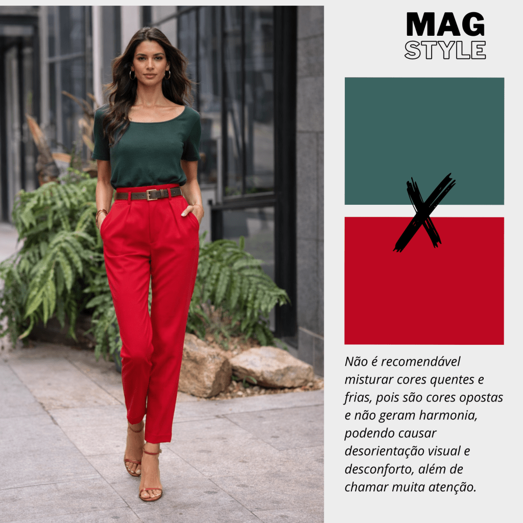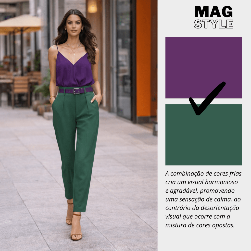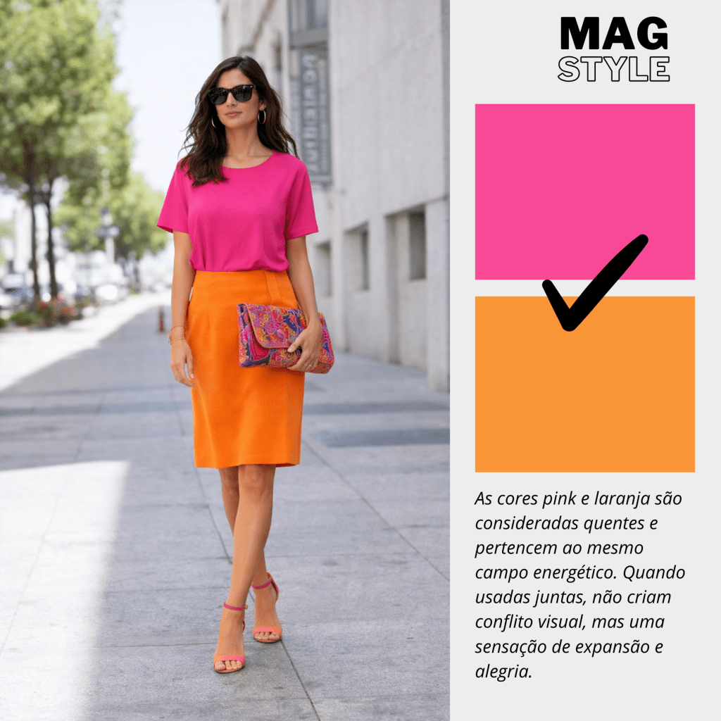O pink traz a dimensão afetiva e emocional, enquanto o laranja está associado à comunicação, criatividade e movimento. Por isso, quando combinadas, formam uma composição vibrante e coerente, muito utilizada na moda para transmitir dinamismo, proximidade e energia positiva. Essa harmonia entre cores de mesma temperatura explica por que certas combinações funcionam de forma intuitiva para o olhar, enquanto outras geram estranhamento.